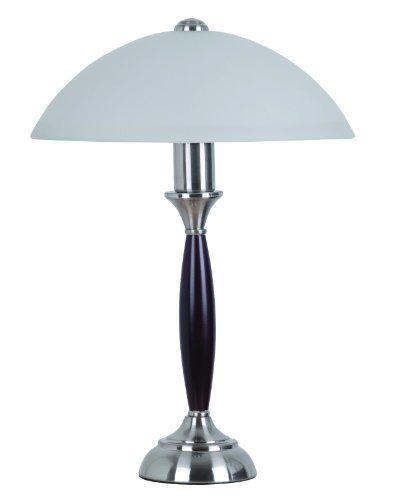 82107-003 Features: -Table lamp. -Brushed Steel finish with faux wood font. -57pct Polyester, 19pct fabric and 24pct other construction. -Frosted glass shade. -On/off switch on socket. -T20 compliant. -ISTA 3A certified. -Eco friendly. -Assembly required. -Manufacturer provides one year warranty. Specifications: -Accommodates (1) 13W CFL bulb (included). -Overall dimensions: 18.5'' H x 12.8'' W x 12.8'' D.